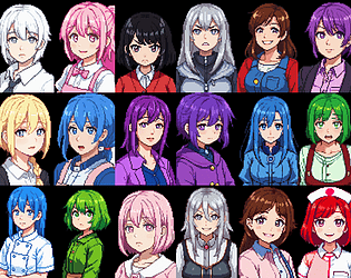 A pack of 261 (at the moment) anime-style female portraits in pixel art style (512×768) with transparent backgrounds.