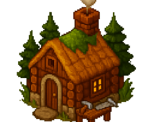 64×64 pixel art forest village sprites: houses, characters, NPCs & animals, cartoony semi-realistic style.
