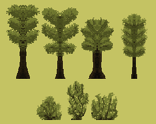 Sprites in pixel art of trees, rocks, grass, tilemaps and some flowers