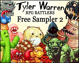 53 static pixel art battlers, featuring humans, monsters and classic jRPG enemies.