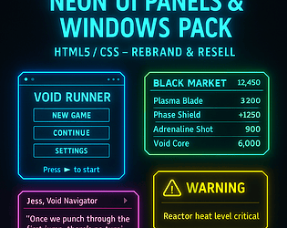 A neon-styled HTML5 / CSS pack of UI panels and windows for menus, HUDs, shops, and popups