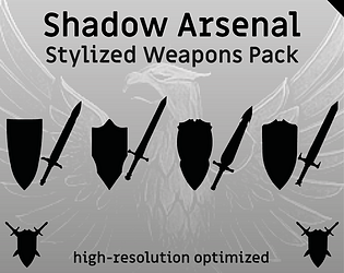 A pack of 19 stylized shadow-themed weapons and shields, perfect for atmospheric and minimalist games.