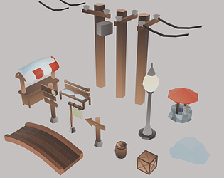 25+ low-poly, game-ready assets: houses, trees, rocks, props, campfire, well, and wheelbarrow. Blender + FBX + GLB.