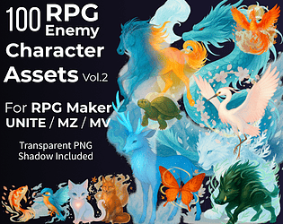 100 enemies/monsters—PNG sprites with shadows for UNITE/MZ/MV; clean scaling, numbered previews, CSV names.