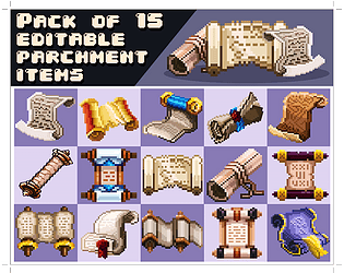 Pack of 15 assorted pixel art scrolls, RPG assets, vector illustration