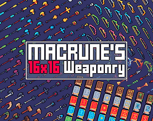 This 16x16 weapon icon pack contains 700+ sprites with 84 of them being unique hand-drawn icons.