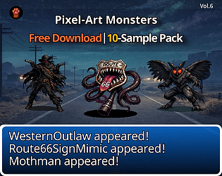 10 free pixel monsters (PNG, S/M @1x). For RPG Maker, Unity, Godot. Commercial use OK.
