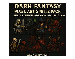 Pack de sprites pixel art 16-bit con héroes, enemigos, dragones y jefes finales para RPG, roguelike y metroidvania.