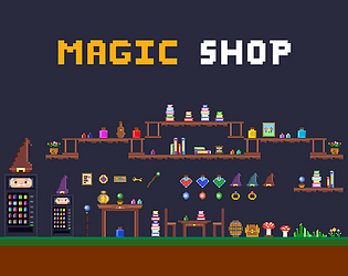 Pixel art fantasy shop assets: furniture, magical items, potions and unique animated wizard vending machine