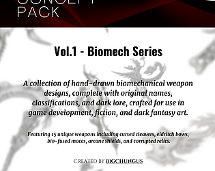 15 hand-drawn biomechanical, horror and gory weapon designs for game devs, designers, and enthusiasts!