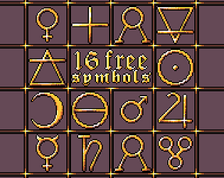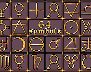 32x32 Pixelart assetpack containing 64 alchemical/astrological symbols in 2 variants: gold and black-white