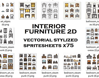 2D furniture sprite pack: flad design, highly detailed, vectorial, stylized, outlined. For Game, Icons, Design, etc.