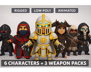 A dark-fantasy chibi hero pack: 6 stylized characters plus 3 themed weapon sets