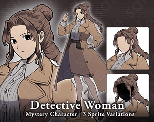A female detective sprite with 3 versions. Perfect for mystery, horror, or visual novel scenes. PNG x3.
