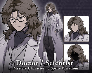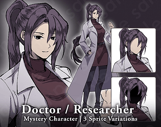 Purple-haired female doctor or researcher sprite for mystery, science, or horror games. Includes PNG x3.