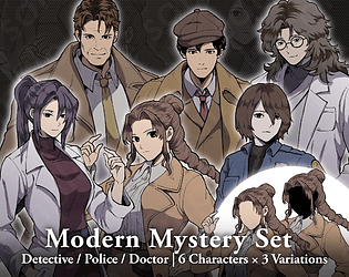 A modern mystery character sprite bundle. Includes 6 characters with 3 variations each. Perfect for dark stories.