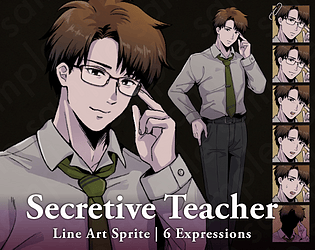 A brown-haired male teacher character sprite in suit. Includes glasses on/off and 6 facial expressions.
