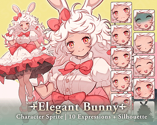 [Fantasy Character Sprite] Elegant Rabbit Girl – Frilly Dress, Long White Hair, Bunny Ears | PNG x11
