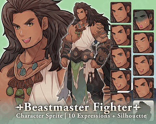 A tanned beastmaster with long brown hair in tribal wear. Great for fantasy games, TRPGs, and more.