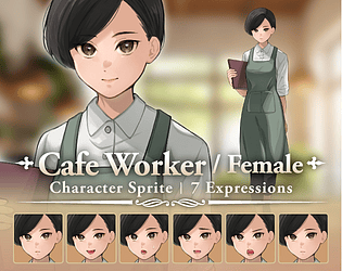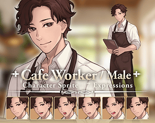 A gentle brown-haired young man in a café uniform. Perfect for modern slice-of-life and background roles.