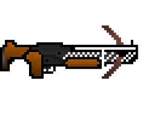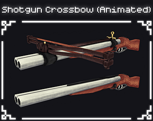 A lowpoly pixelated shotgun with a crossbow attached to it, fully animated.