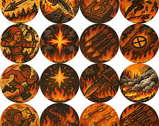 A pack of 20 hand-painted, dark fantasy skill icons in a fiery forest/war theme.