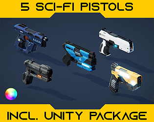 A pack of 5 sci-fi pistol models with adjustable color shader (URP)