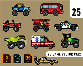 25 high-quality cars. This asset is perfect for a side scrolling game, or even a turn based RPG type game.