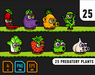 25 high-quality predatory plants. This asset is perfect for a side scrolling game, or even a turn based RPG type game.