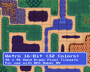 Redesigned World_A1 & A2 tilesets for RPG Maker MV, made with a retro palette to craft nostalgic RPG worlds.