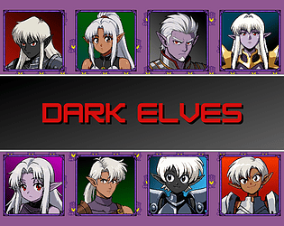 128x128 Retro Anime-styled Fantasy portraits of Dark Elves, including different default skin colors and clothing styles