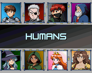 128x128 Retro Anime-styled Fantasy portraits of Humans, with varying classes and character types