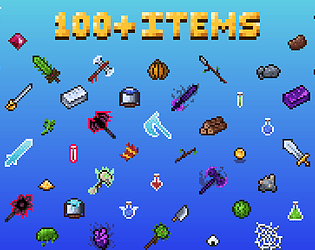 A 16x16 pixel art asset pack with weapons, materials, potions, food and animated coins totalling 109 items