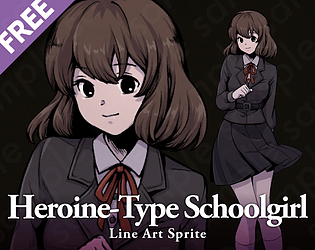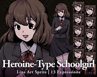 Line art sprite of a cheerful high school girl in a blazer. Includes 13 expressions for mystery or school stories.