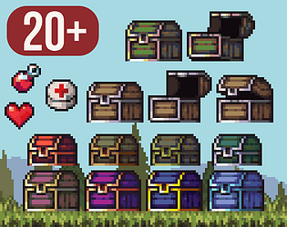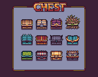 12 pixel chest sprites in 32×32 resolution. Perfect for RPG loot, treasure systems, or inventory icons.