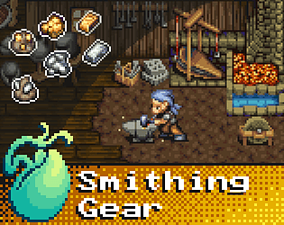 A huge collection of 16x16 pixel art icons and objects for blacksmithing gear, and mining nodes, ores, and ingots.