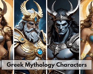 A collection features high-quality illustrations of gods, titans, demi-gods, and heroes from Greek mythology