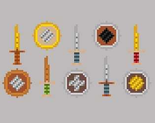 16 px base grid swords, potions and shield sprites in different colours