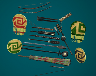 A set of 11 Aztec melee weapons, 2 ranged weapon and 2 shields, comes with PBR textures in 3 resolutions (1k-4k).
