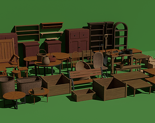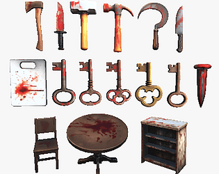 A 16-piece set of bloody weapons, tools, and furniture perfect for horror games.
