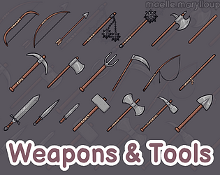 32 unique sprites including swords, pickaxes, axes and hoe's (8 of each)