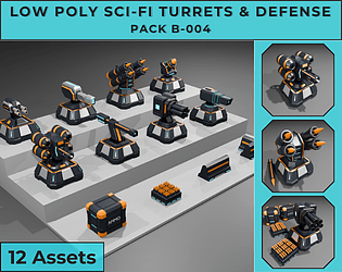 12 low-poly sci-fi defense assets: turrets, barriers and ammo props for tower defense, RTS and prototypes.