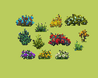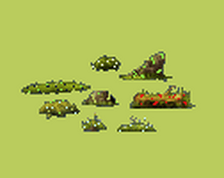Sprites in pixel art of trees, rocks, grass, tilemaps and some flowers