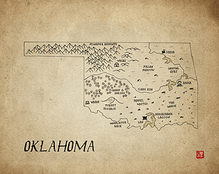 Labeled and blank versions of Oklahoma as a fantasy map, on parchment and in black/white