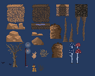 A pixel art tilemap with dessert and cave elements to make a 2D side scroll.