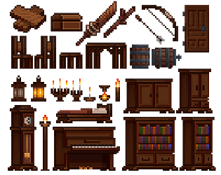 A downloadable pixel art pack of wood items and furniture.