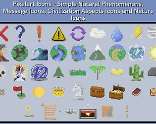 50 game icons drawn in pixelart based on natural aspects of the world, from physical level to abstract interpretation