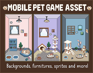 Cat, Dog, Bunny, Backgrounds, Furnitures and sprites. Everything you need to create a game like Tamagotchi.