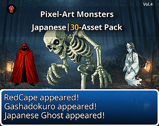 30 pixel yokai & urban legends (PNG, S/M/L @1x). e.g., Ashigaru,etc. For RPG Maker, Unity, Godot. Commercial use OK.