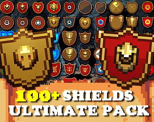 A downloadable asset pack with 100 unique shield sprites!